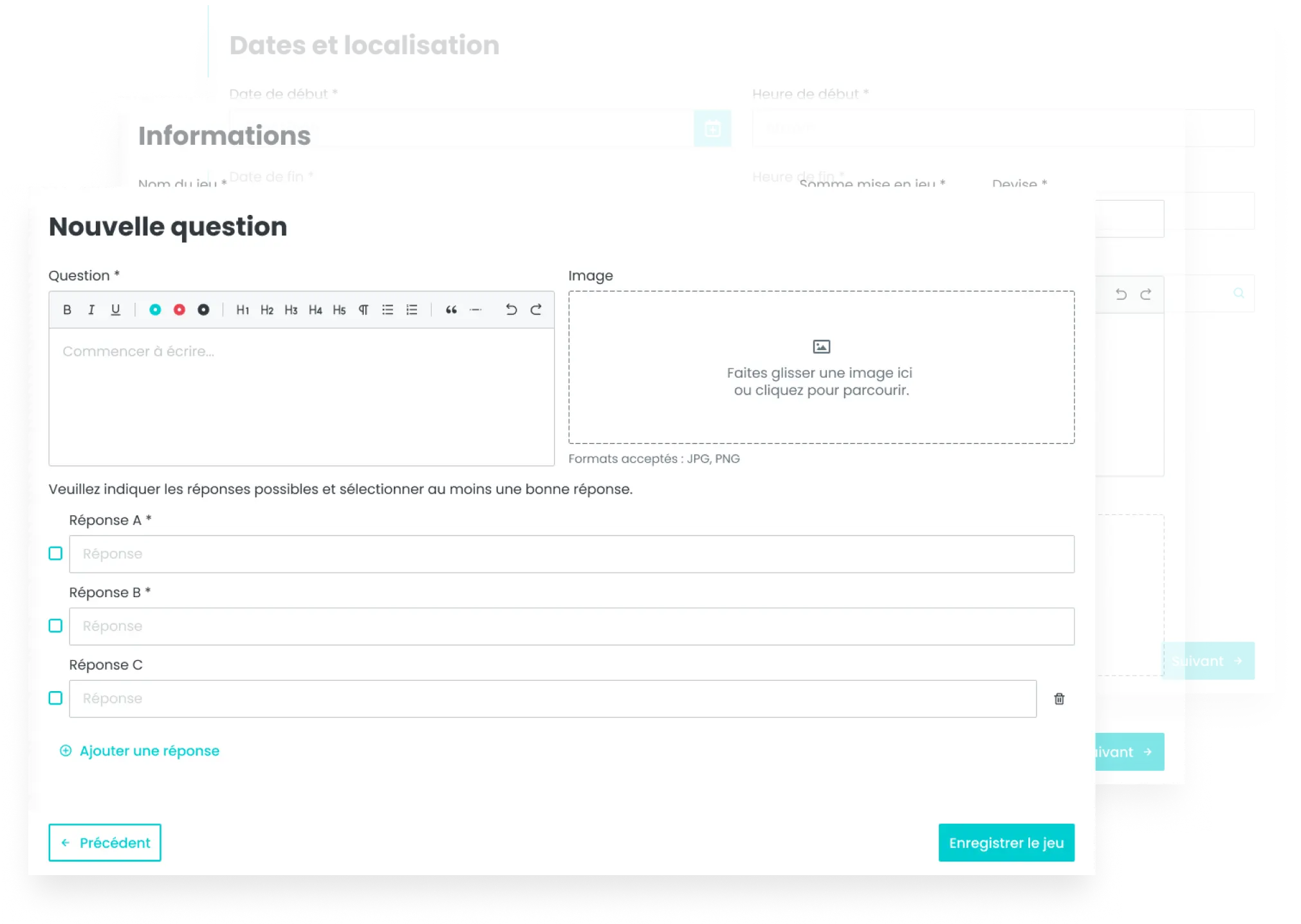 Créez les questions et les réponses de vos jeux facilement ! Ajoutez des médias, votre brochure commerciale et le lien vers votre site internet pour promouvoir votre produit ou votre service.